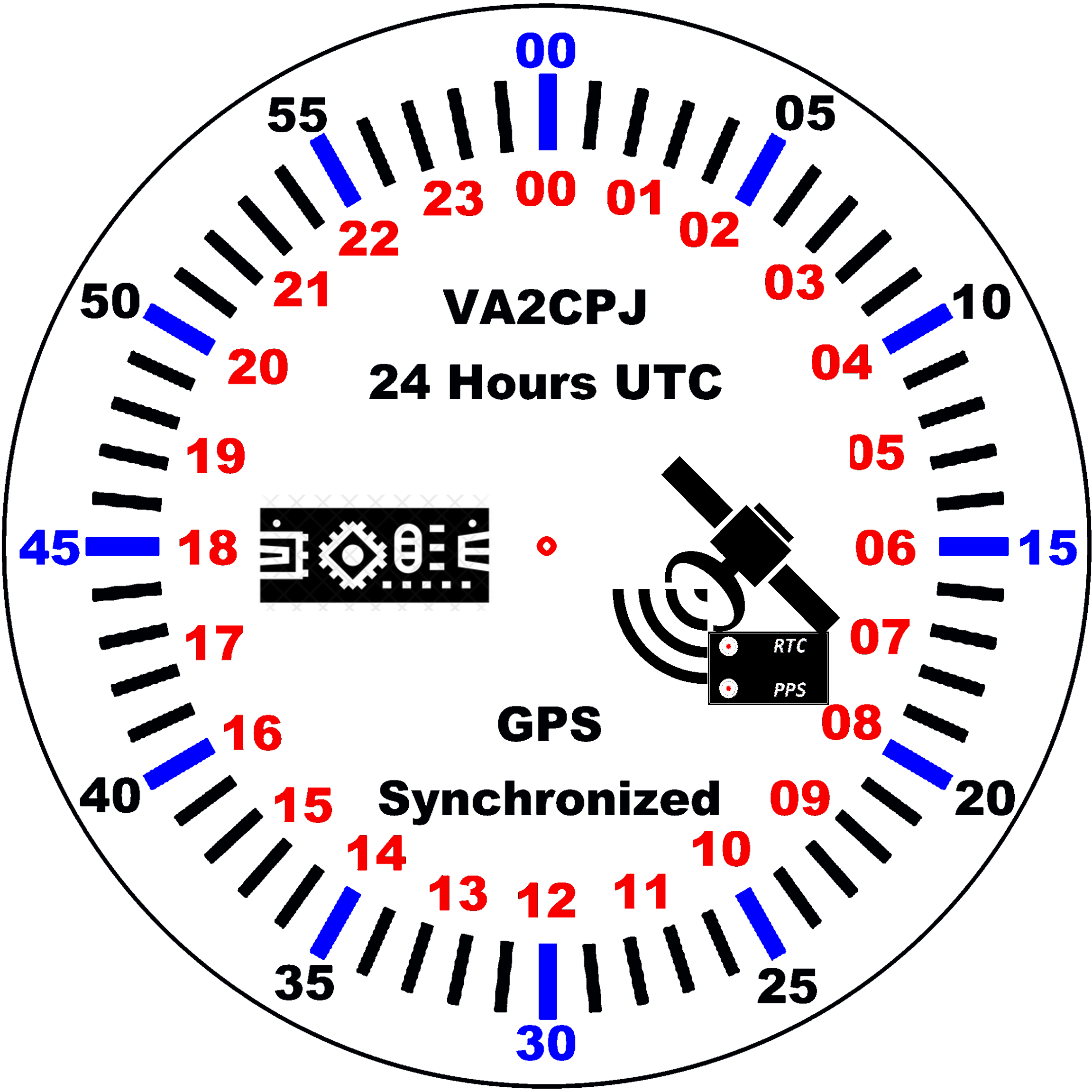 Horloge pseudo synchronisée par signal GPS. Pseudo car seule les secondes sont maintenues en phase (+-10 msec.) par le signal PPS d’un module GPS (Adafruit ref:4) et un module RTC DS3231 (ref:3). Le circuit DS3231 possède un réseau de capacités que l’on peut commuter pour ajuster l’oscillateur. Utilise un module nano et un mouvement d'horloge 24 heures à quartz de type Lavet modifié (ref:1 & 2), un mouvement qui saute par seconde et non un pseudo mouvement continu. 1 bouton sert a stopper le moteur afin de mettre l’horloge a l’heure. Le cadran de l’horloge est imprimé sur une feuille transparente collée sur un disque de bois (Amazon ou boutique de bricolage/peinture) de 20 cm de diamètre. Le système est alimenté par un chargeur USB et pour la sauvegarde par une batterie lithium de 3.7 Volts.