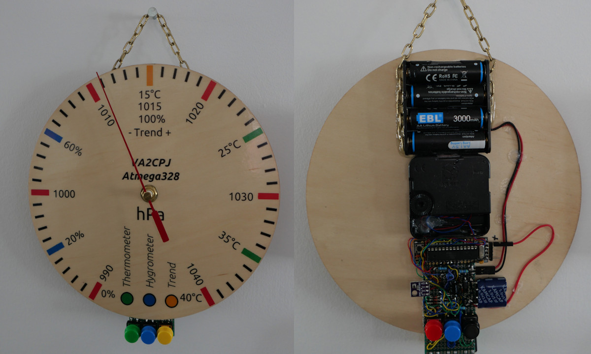Le cadran du baromètre est imprimée sur une feuille transparente collée sur un disque de bois (Amazon ou boutique de bricolage/peinture) de 20 cm de diamètre.